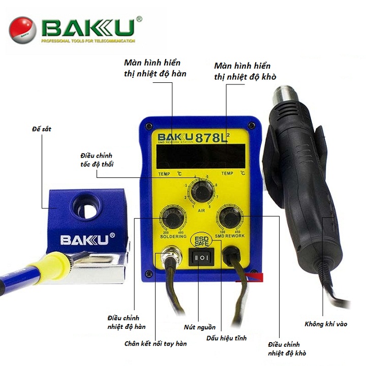 1. Máy khò và hàn BAKU-878L được thiết kế gọn gàng. BAKU-878L nhìn rất chắc chắn, khỏe khoắn không chỉ phù hợp với môi trường sửa chữa và nhà xưởng mà còn rất thích hợp với việc đặt tại từ cửa hiệu lớn cho tới cửa hàng nhỏ