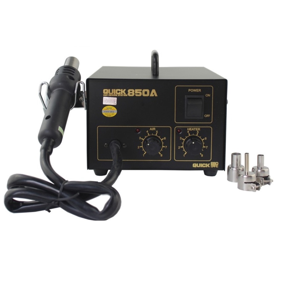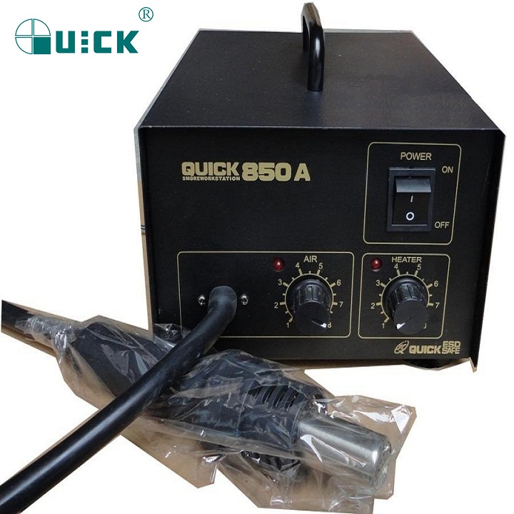 Thiết kế đơn giản, dễ sử dụng. Dải điều chỉnh nhiệt độ rộng: từ 100 – 400 độ C, Với máy nén khí tiêu chuẩn (pump) lượng gió từ đầu khò của  Quick 850a đều và ổn định, dễ dàng cho các thao tác kỹ thuật - Dùng trong việc sửa chữa phần cứng máy điện thoại di động. Hàn, đóng, nhấc các loại linh kiện chân rết, chân gầm, hàn tạo chân chíp sét.